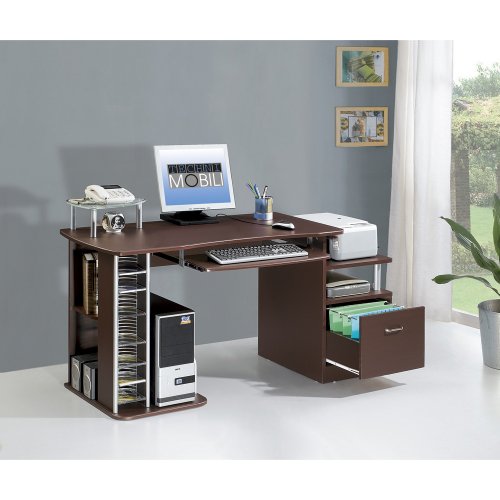 RTA Products computer workstation with file is constructed of engineered wood with a Chocolate laminate surface.Computer workstation features a letter size hanging file drawer, vertical CD rack, side shelves, printer shelf, large keyboard tray with safety stop, and an elevated tempered glass shelf.Ships ready to assemble.