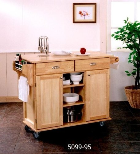 This furniture arrives unassembled. Features: Solid wood construction in Natural finish Brushed Steel Hardware Two utility drawers Double door storage cabinet with adjustable shelf Center storage area with two shelves Spice rack/towel bar Paper towel holder Heavy Duty Locking Rubber Casters Easy to Assemble Finish: Natural Dimensions: 24"(W) x 49 3/4"(D) x 35 1/4"(H)