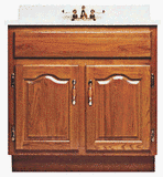 Ready to assemble solid oak and plywood construction. Full face frame and cathedral arched 3 4" raised panel design doors are solid oak. Plywood cabinet has real oak veneer exterior and interior. Bright brass and oak hardware included. Exposed door hinges