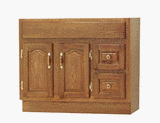Ready to assemble solid oak and plywood construction. Full face frame and cathedral arched 3 4" raised panel design doors and 2 drawer fronts are solid oak. Plywood cabinet has real oak veneer exterior and interior. Bright brass and oak hardware included.