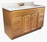 Ready to assemble solid oak and plywood construction. Full face frame, cathedral arched 3 4" raised panel design doors and 6 drawer fronts are solid oak. Plywood cabinet has real oak veneer exterior and birch finish interior. Bright brass hardware include